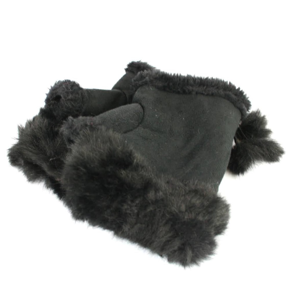 Smart fingerless gloves with faux fur edges and cuffs. Suede-look fabric with drawstring tie. Adult size. Forest Green. Great for autumn and winter.