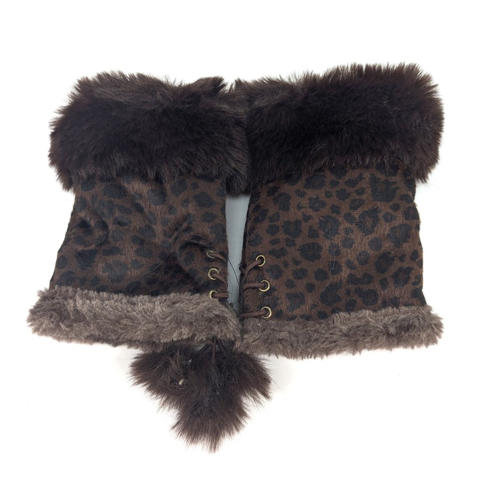 Cosy yet bold, these dark brown animal print fingerless gloves combine soft suede effect fabric with warm faux fur accents. The pompom cord detail ensures a secure fit while adding a fun, fashionable flourish.