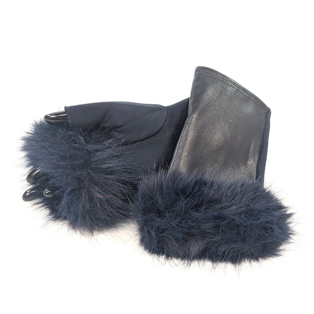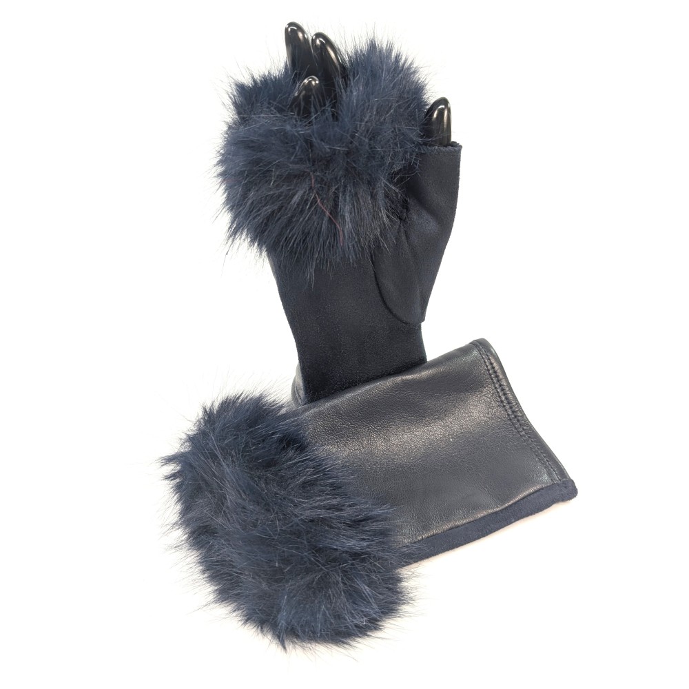 Vegan Leather and Faux Fur Fingerless Gloves _ Navy Blue | Ladies Gloves